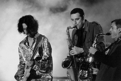 Dos saxos y una guitarra Fotografía tomada el dia 19 de Junio de 1998 durante un concierto de Presuntos Implicados en Andraixt (Palma de Mallorca) quiero destacar que esta hecha con el zoom a 200 m/m y una velocidad de 1:40, tomada en color y posteriormente cambiada a ByN. Camara Nikon F-90X Objetivo Sigma 70-210 f-2.8 |