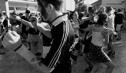 Hooligans Escocia a empatado, así lo celebran los escoceses que estan de vacaciones en Magalluf (Palma de Mallorca), cánticos antes y despues del partido, banderas, caras pintadas, se han metido en una fuente publica hasta que la policía los ha sacado, su comportamiento fué bastante pacifico y no causaron destrozos. Cámara Nikon F-90X, Objetivo Sigma 18-35 |